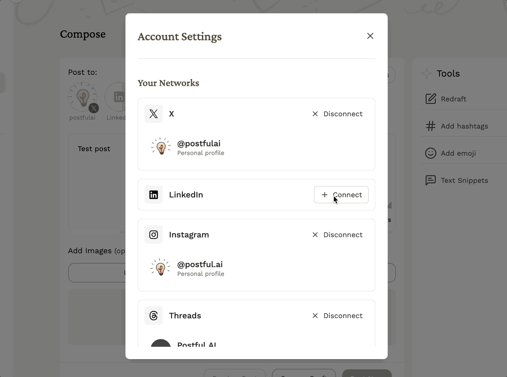 - Click Connect next to the LinkedIn icon (in onboarding or in the Settings modal).