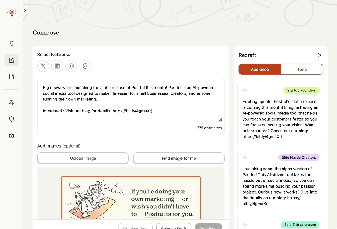 Redraft helps you quickly adapt a post for different audiences or tones without starting from scratch.