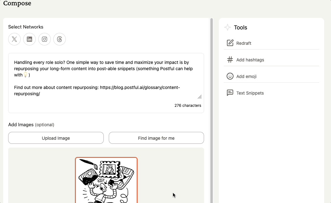 The Text Snippet feature lets you save and reuse pieces of text you often use in your posts, such as calls-to-action, hashtags, or common phrases.